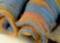 Three carded wool batts made with silky British Blue Faced Leicester wool dyed with woad and wool dyed with weld and madder. The wool batts are mainly blue with orange accents.